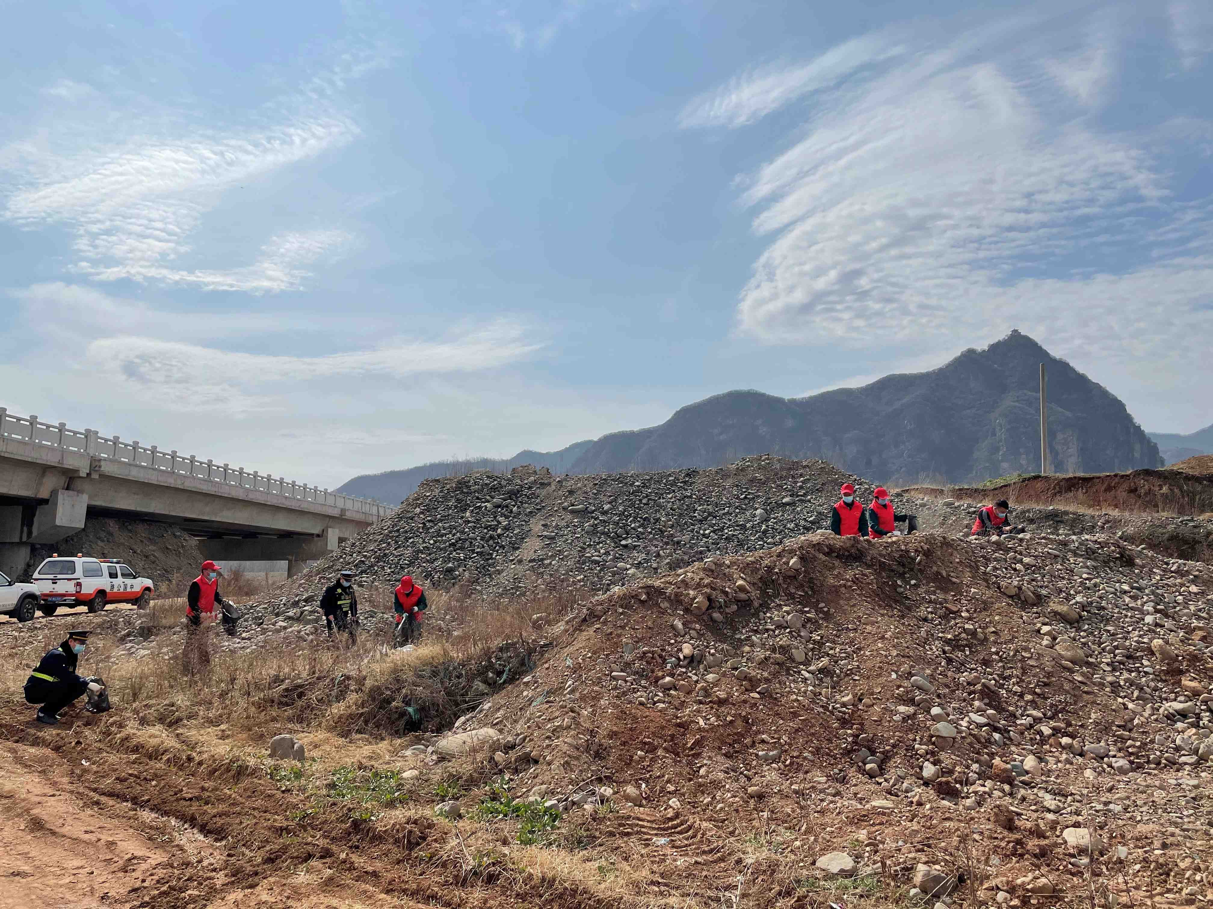 上午11点30分,旧县服务区值班经理带领服务区和驻区路产管理大队一同前往伊河河滩清理白色垃圾。河滩边风景秀丽,河水清澈,然而散落的白色垃圾破坏了这美丽的风景。
