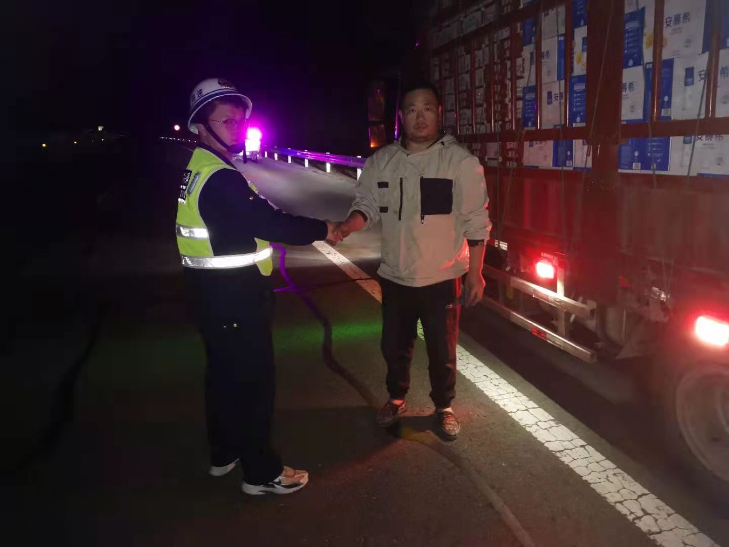 单位:洛宁路产大队 发布时间:2021-03-192021年3月17日20时30分,洛宁路产管理大队在进行日常巡逻时,发现一辆小型货车在路边停靠,立即下车询问情况,得知该车因途中轮胎爆胎,被迫停靠路边。路产管理人员现场指导做好安全警示标志,帮助司机完成轮胎更换。“同志,今天如果没有你们的话我真的不知道该怎么办了!真的太感谢你们了!”看着轮胎被换好,司机师傅激动的说道。