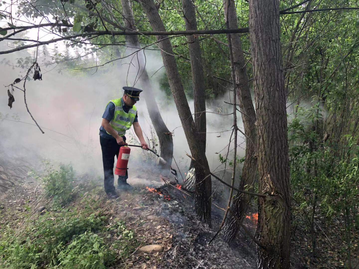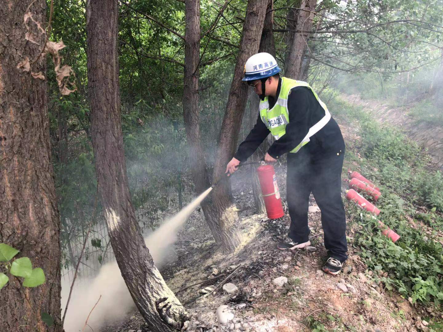洛宁路产管理大队收到消息后立即出动。到达目的地后迅速摆放安全警示标志,疏导指挥车辆通行;快速从车上取下灭火器,冲到着火地点上风向处,对起火点进行喷射,经过大约10分钟,终于将明火扑灭,为高速公路车辆通行消除了隐患。近期天气干燥,高速公路旁花草较易燃,司乘人员途中应注意防火,妥善处置烟头;同时也提醒高速公路沿线的群众,春耕生产在即,烧荒时应当有专人看管,避免引发火灾。