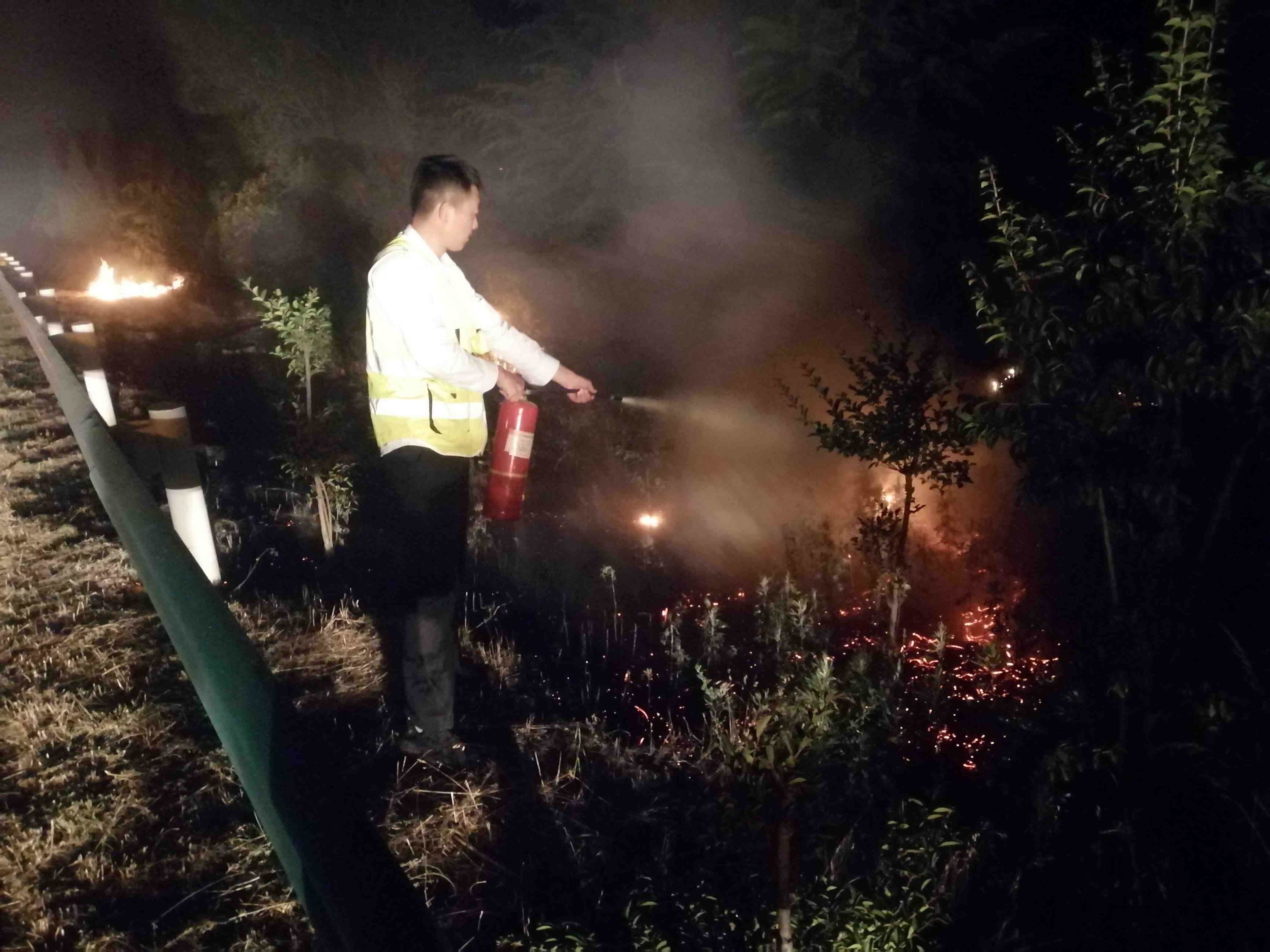 5月28日晚23:00,嵩县运维大队当班维护员在完成抢修任务的返回途中,途经洛栾高速上行K16+900公里处时,发现防护隔离网外侧有火情,并有浓烟向高速公路弥漫,运维人员迅速下车设置警示标志,安排人员提醒车辆注意安全,其他人员立即利用车上所带灭火器进行灭火。经过10多分钟的努力,现场蔓延的火势得到彻底控制,明火全部被扑灭,险情解除。