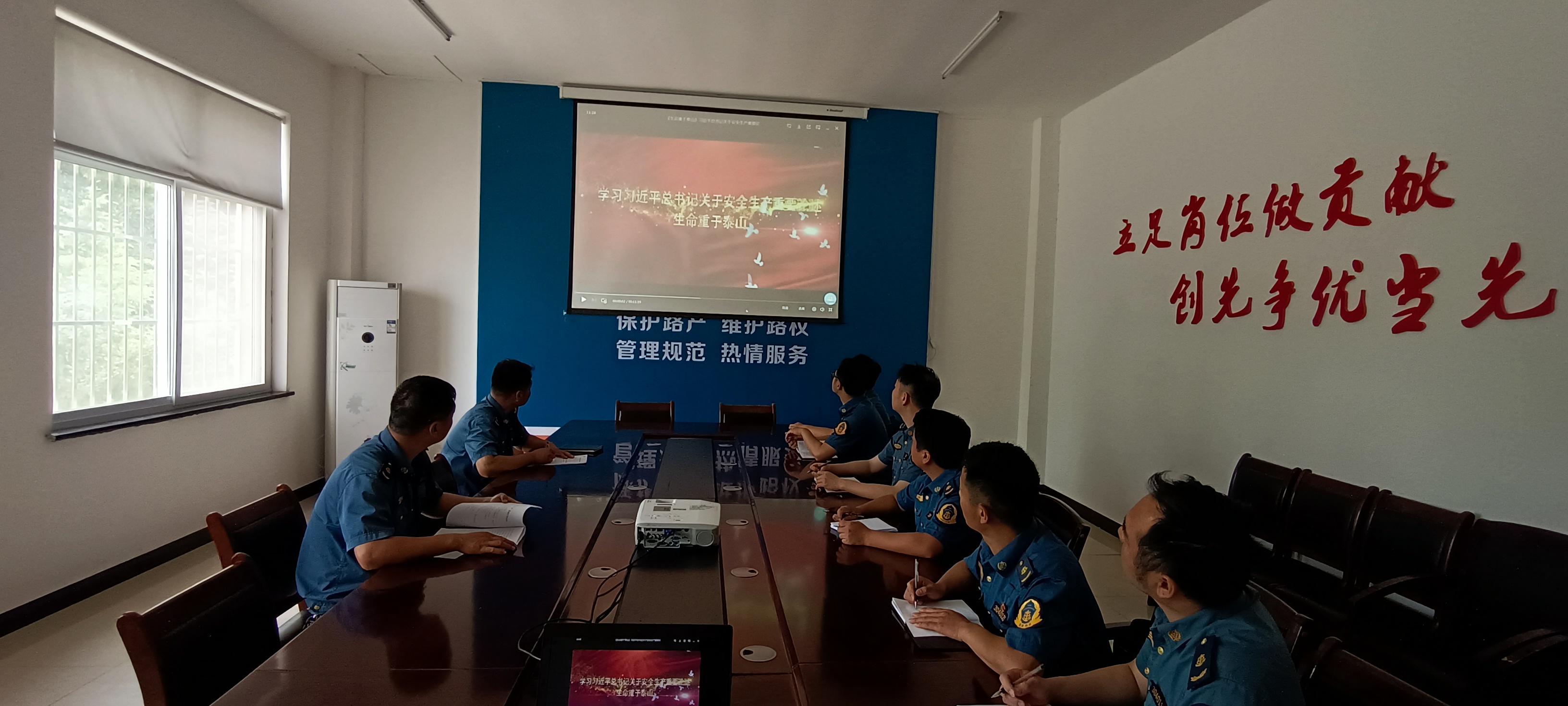 一是组织队员集中学习观看《生命重于泰山一一学习习近平总书记关于安全生产重要论述》电视专题片和《下好先手棋打好主动仗一一习近平总书记关于防范化解重大风险重要论述综述》,进一步提高站位,强化安全意识。二是组织学习《河南省安全生产条例》《河南省安全生产风险管控与隐患排查治理办法》等安全生产法律法规,引导员工学法、懂法、守法,并能够按照法规和规范要求开展工作。最后,大队长做总结发言,指出安全生产是最大的民生,任何时候都要紧绷安全生产这根弦,全体人员必须清醒认识到安全生产形势依然严峻,要充分做好安全生产隐患排查梳理,牢固树立安全生产意识,增强红线意识、监管保障,对桥、隧、高边坡等重点部位加强排查,坚决防范遏制安全风险,保持洛栾高速稳定向好的态势。