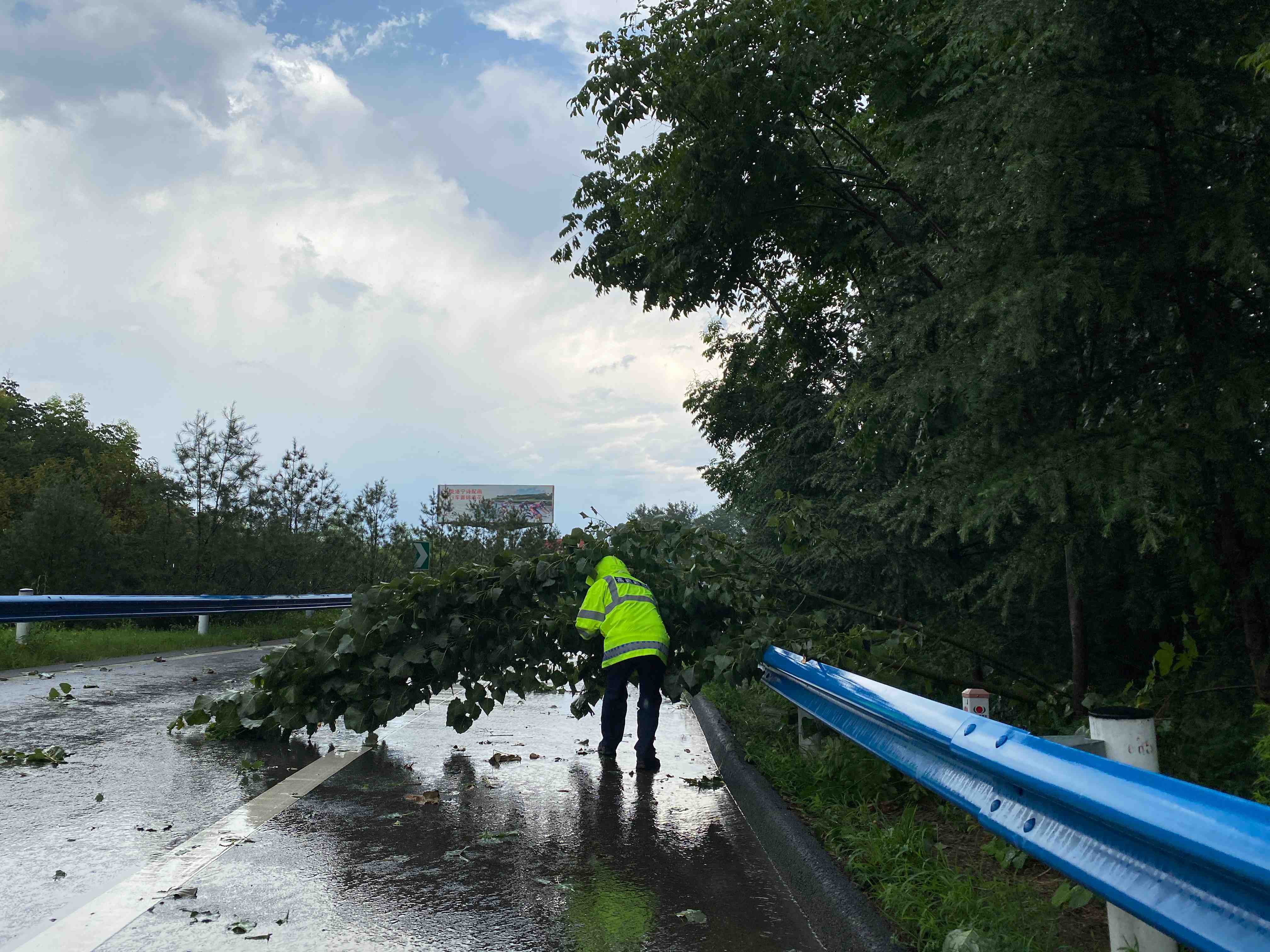 在巡查中发现狂风已将洛宁收费站上道口护栏板外的一棵大树连根拔起,树干倒落在高速公路上,严重威胁高速公路行车安全,值班队长迅速组织备勤人员冒雨进行清除。经详细排查,由于风力太大,仍有部分树枝和杂物散落在路面上,在处理完倒塌树木后,队员及时对道路进行全面清理,彻底消除道路安全隐患。