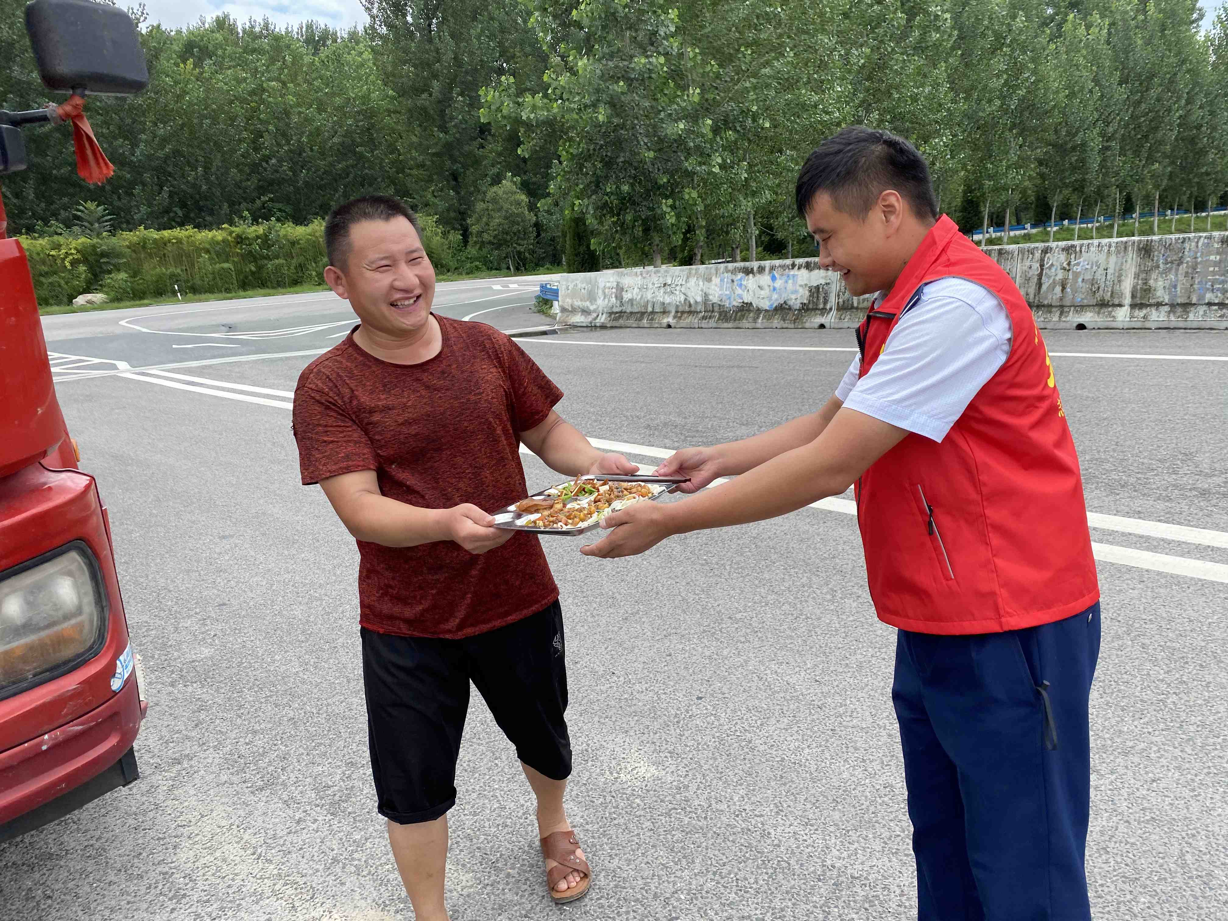 7月21日,因强降雨交通管制,三辆鲁Q货车在洛宁西站外广场滞留,洛宁西收费站组织红思路志愿服务队及时为司乘人员送去饭菜、热水,并安抚司机焦虑情绪,帮助司机查询路况信息和绕行路线。