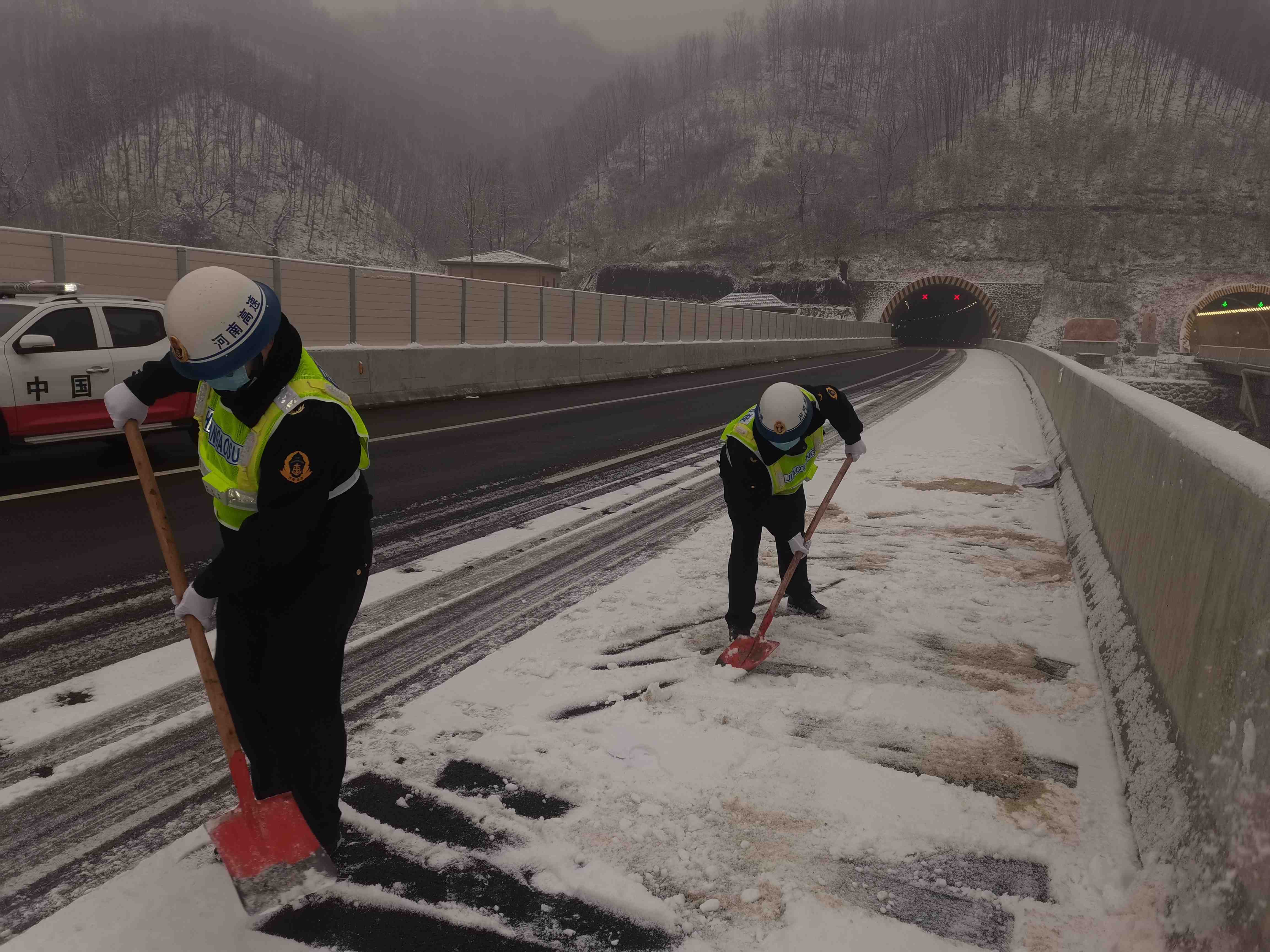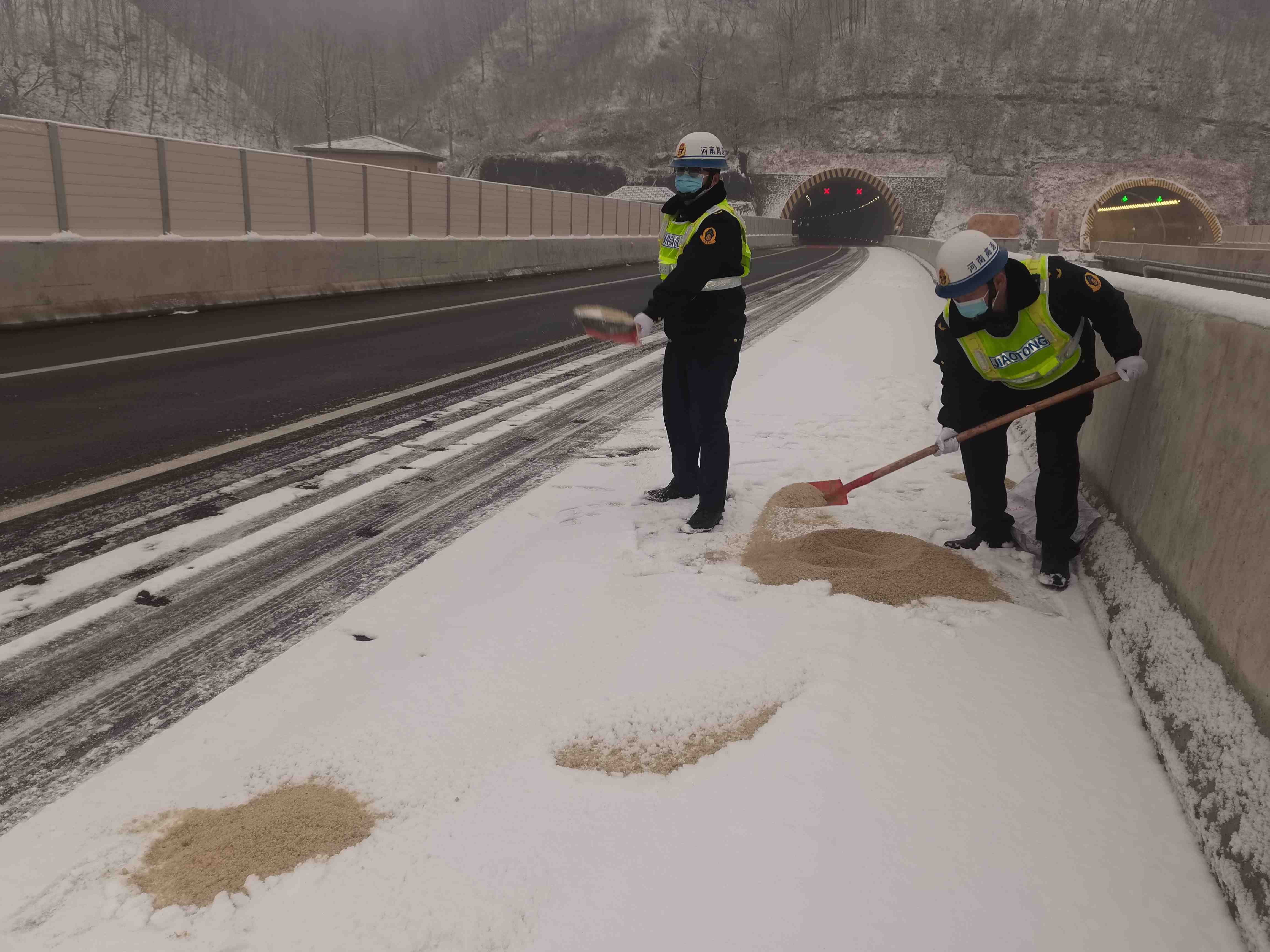 单位:尧山西路产大队 发布时间:2022-01-052022年1月4日,尧山西路产管理大队启动冰雪恶劣天气应急预案,迎寒风、战冰雪,采取多种措施消除路面冰雪,确保辖区路段路畅人安。5日上午,尧山西路产管理大队大队长带领路产队员加强巡逻,重点排查辖区内弯道、桥梁、隧道等危险事故隐患路段,对尧栾高速木札岭隧道出入口二次结冰路面进行人工清除,路产队员通过给路面铺撒防滑料、融雪剂等材料来彻底清理桥梁结冰地面,全力为人民群众提供“安全、便捷、舒适、满意”的公路通行环境,保障道路交通安全畅通。