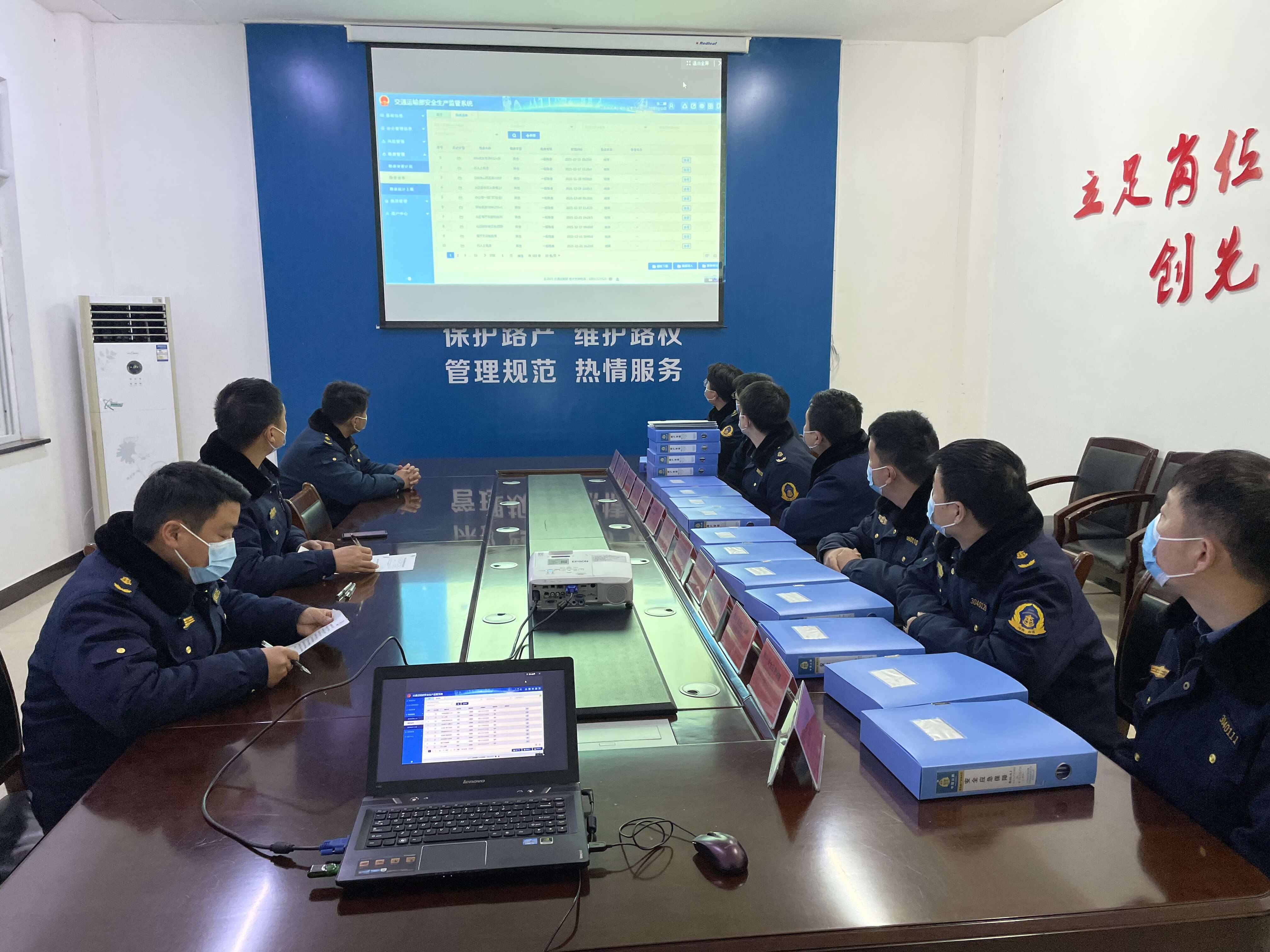 单位:嵩县路产管理大队 发布时间:2022-01-07为了进一步提高高速公路路产管理工作效率,优化路产管理办公环境,根据省厅、高速中心、交发集团等上级关于开展信息化系统办公的相关要求,2022年1月6日,嵩县路产管理大队组织在岗人员进行学习培训,将系统登录并投屏,大队长进行讲解及操作流程。