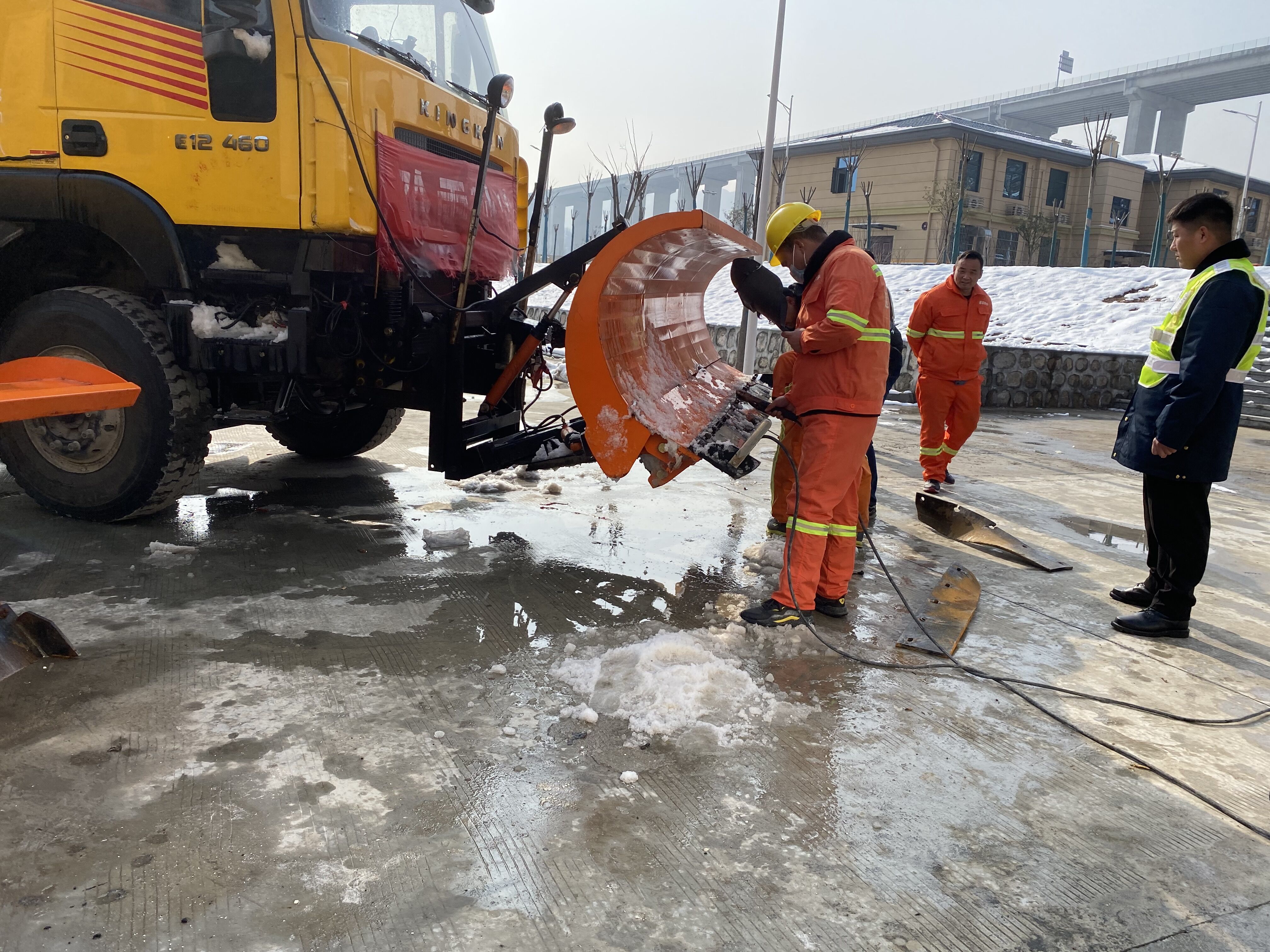单位:尧山西养护所 发布时间:2022-01-25持续奋战除雪融冰近一周,尧山西养护管理所除雪设备推雪铲、融雪剂撒布机、保通车辆连续高效运转,高负荷连续工作使设备存在铲板螺丝松动、变形损坏、撒布机低温漏油、保通车轮胎损坏等一系列影响除雪工作效率的设备问题。雪后初晴,尧山西养护管理所利用停雪晴天,全力以赴,抢抓停雪空档期检修除雪设备,第一时间组织养护检修人员针对除雪融冰机械设备进行检修、改进、更换,为迎战下一轮除雪融冰、提高除雪效率、保障春运期间道路安全畅通做好充分准备。