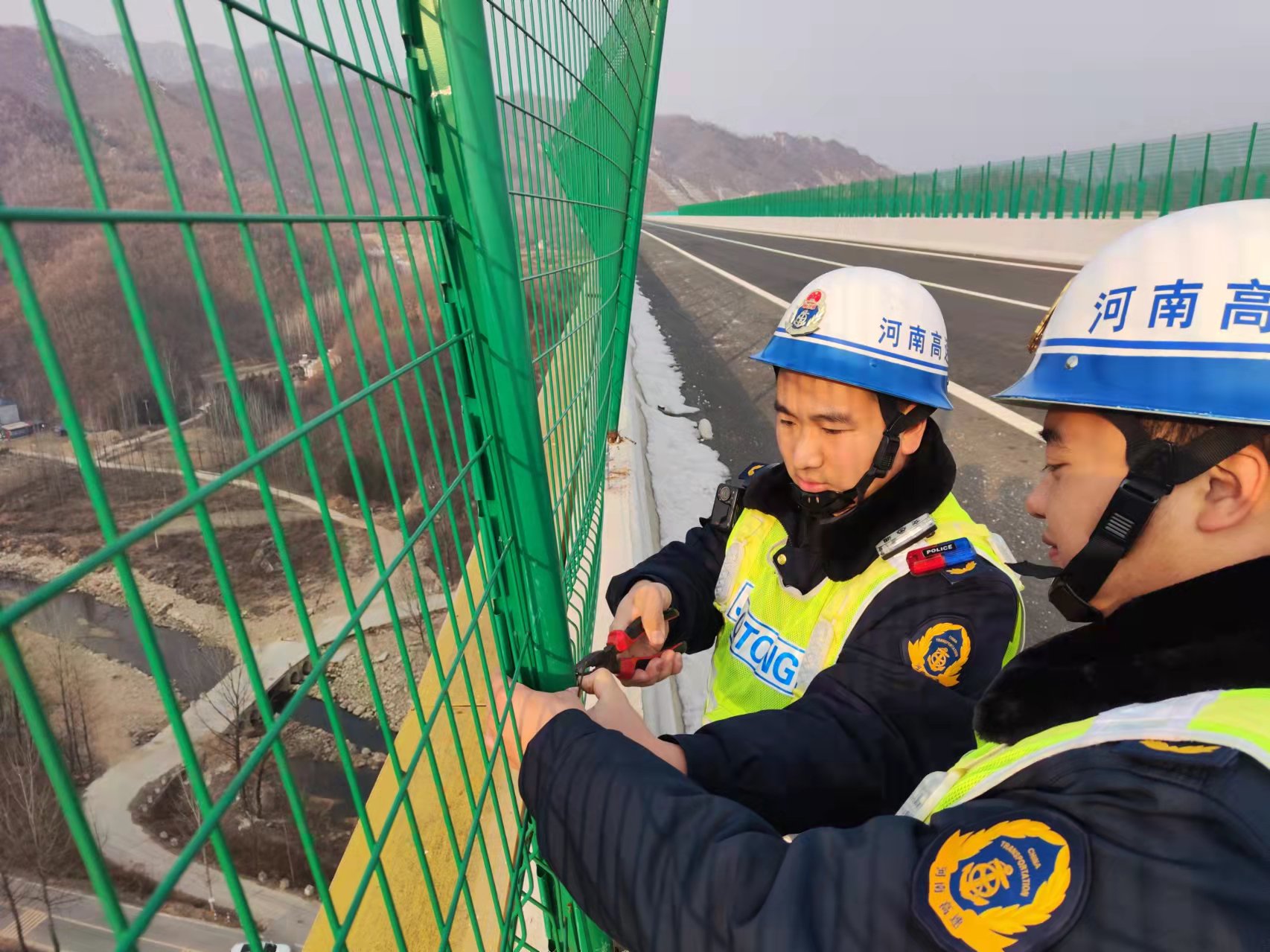 巡查员们使用随车携带的钳子、铁丝对破损的隔离栅进行维修。此次行动,共修复损坏隔离栅5处,倒伏公里牌1处。不仅维护了高速的封闭性和安全性,也更好的保障了郑栾高速尧栾段的安全畅通的通行环境。