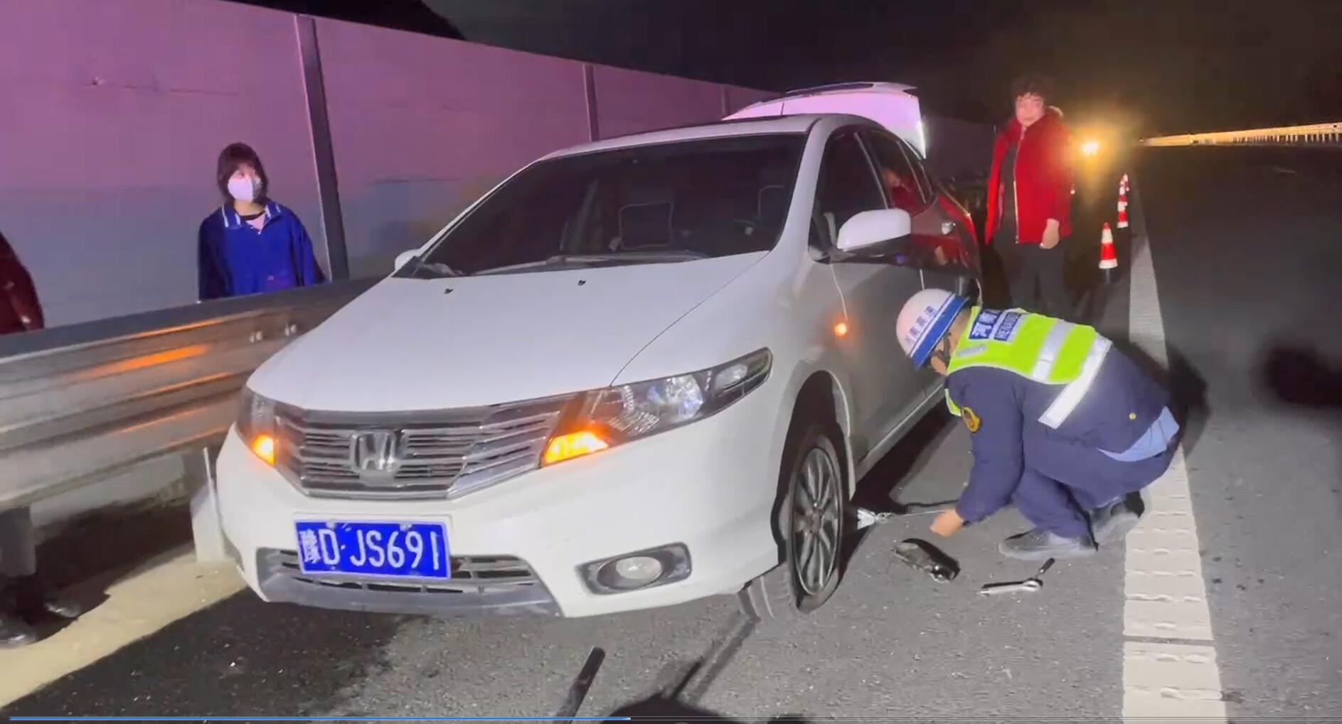 帮助司机换轮胎 举手之劳暖人心