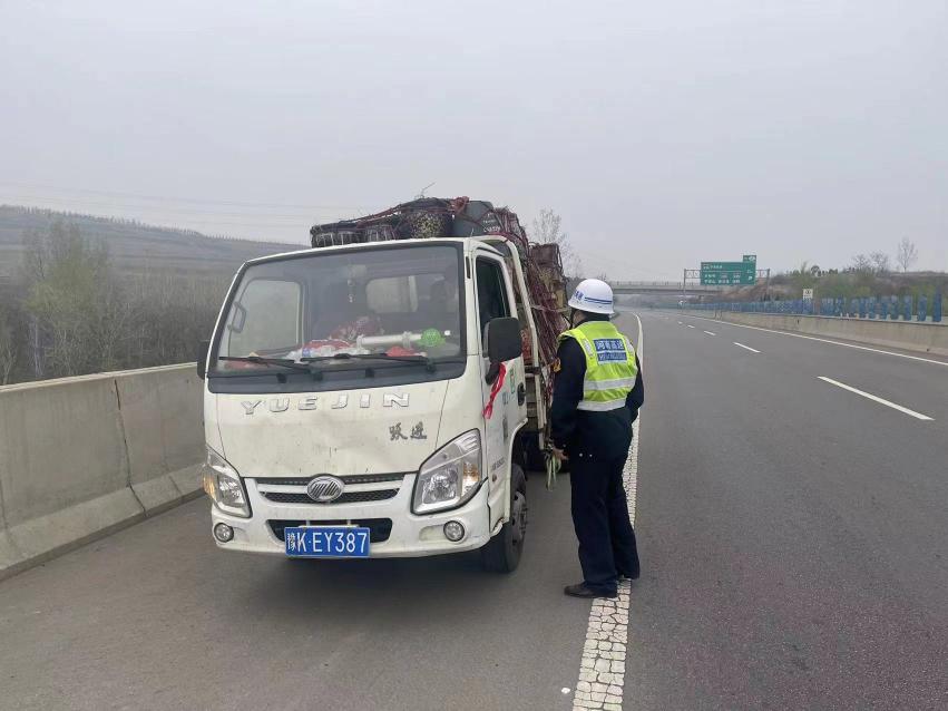 3月30日下午16时05分,宜阳路产管理大队巡查人员在巡查过程中发现离宜阳收费站500米附近,一辆小型货车所装载的货物已向右边倾斜。“货物像一座小山,驾驶员似乎没发现异样,仍在继续行驶,再不整理,很可能出现翻车!”巡查人员意识到问题的严重性,立即通过喊话器让该车靠边停下,同时把巡罗车开在货车后方,开启警报灯提醒其他车辆注意。在路产人员的护送下缓缓行驶至附近的收费站出口。