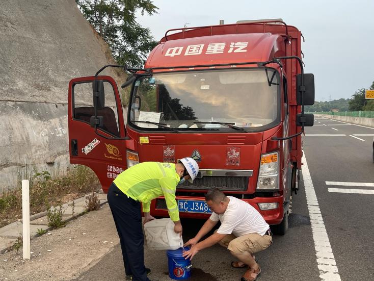 了解情况后,路产人员立刻拿出车上的备用水桶,帮助司机加水冷却,并检查是否还有其他故障。经过十余分钟的检修,故障车辆恢复正常,司机看着汗流浃背的路产人员,感激道:“太感谢你们了,这么热的天,一直在帮忙排除故障,谢谢你们!”