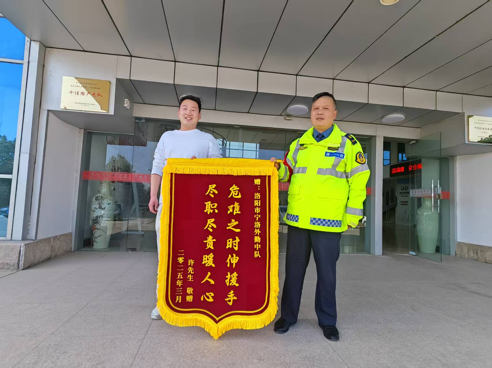 3月25日,身体恢复后的许先生心怀感恩,专程来到宁洛洛阳路产外勤中队,亲手送上一面锦旗。锦旗飘扬,承载的不仅是许先生的感激,更是宁洛洛阳路产外勤中队始终坚守“以人为本、安全至上”服务理念的生动见证。