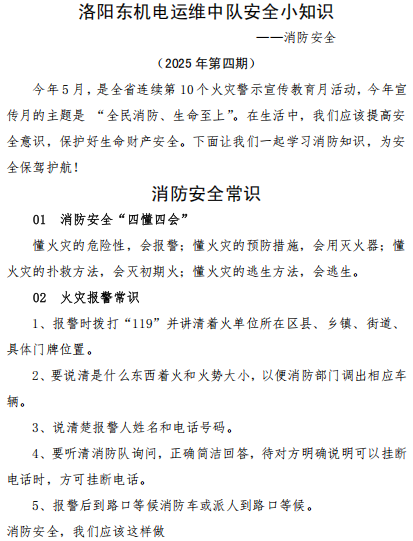 单位:洛阳东机电运维中队 发布时间:2025-06-13为进一步做好职工安全教育工作,洛阳东机电运维中队以当前安全生产月活动为契机,结合防汛工作、防灾减灾工作等具体要求,利用微信群开设,定期发送安全小知识。