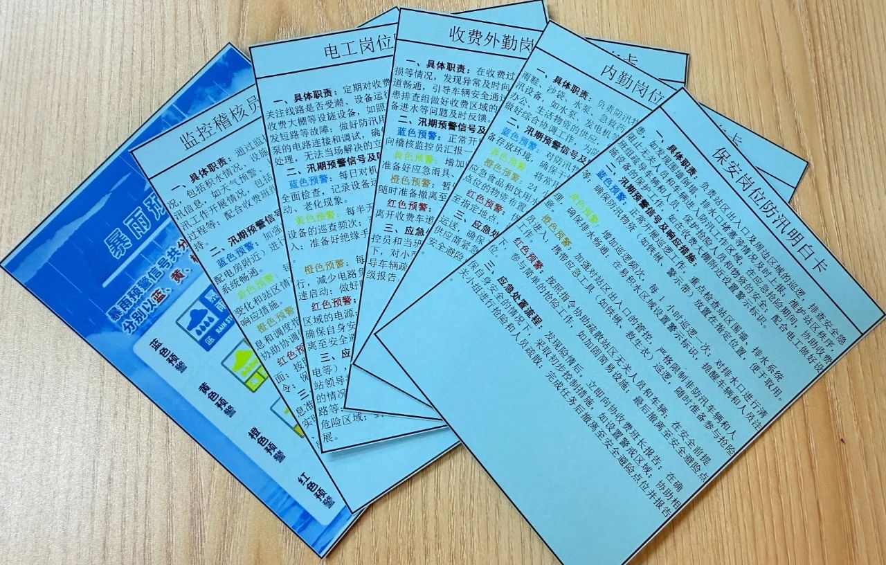针对收费外勤员、监控员、电工、后勤保障等不同岗位的特点,清晰列出了各岗位在汛期的具体职责、汛期预警信号及响应措施、应急处置流程等关键信息。卡片内容简洁明了、重点突出,便于员工快速掌握和查阅,确保在汛情发生时,各岗位人员能迅速反应、协同配合。同时,通过卡片发放强化员工防汛责任意识,并计划结合内容开展应急演练,检验处置能力,确保措施落地。