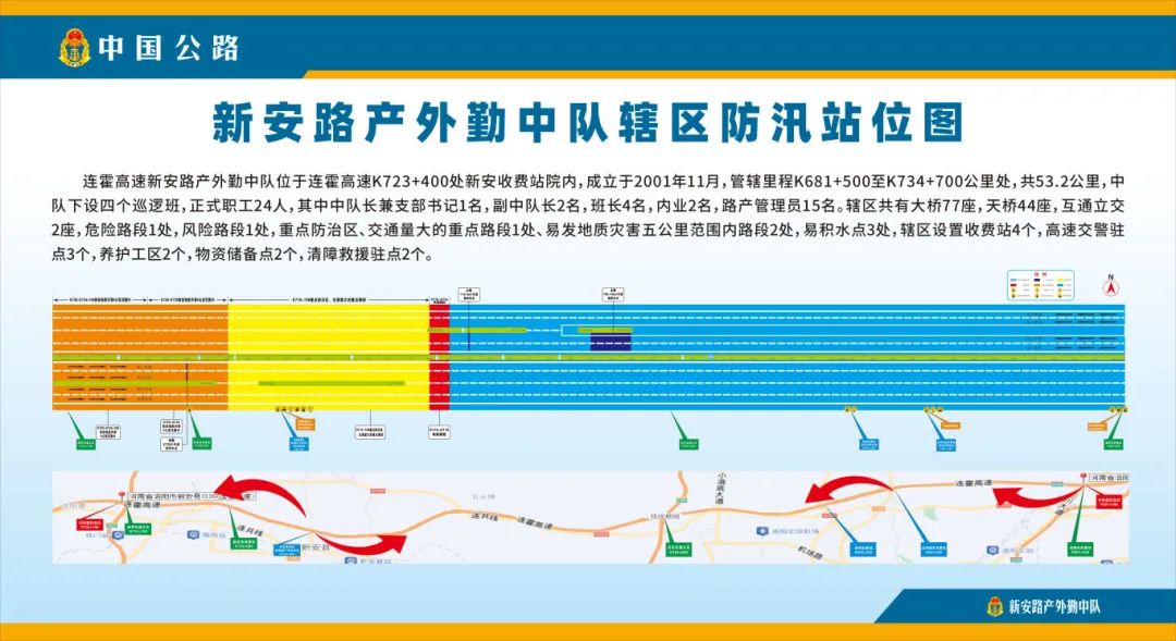 单位:新安路产外勤中队 发布时间:2025-07-23为深入贯彻集团及洛阳分公司汛期工作部署,聚焦高速公路灾害防御核心任务,近日新安路产外勤中队结合辖区防汛工作实际与重点任务,精心编制完成防汛"站位图"。