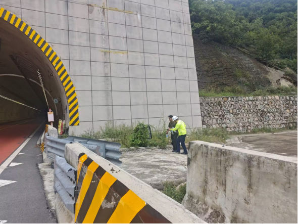 单位:龙峪湾路产外勤中队 发布时间:2025-09-02 2025年8月30日上午,龙峪湾路产外勤中队队员在巡逻至木札岭隧道入口时,发现一名身旁有编织袋等物品的人员在高速公路护栏外活动。该路段车流量较大、行驶速度较快,且隧道入口处光线存在变化,现场存在安全风险。