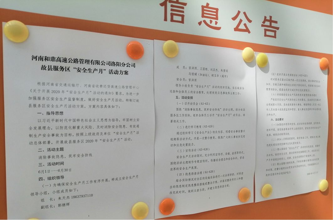 一是下发《故县服务区2020年“安全生产月”活动方案》,引导每个职工加强学习,积极参与到“安全生产月”活动中来.