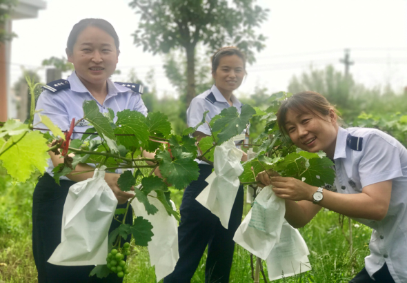 旧县收费站全体员工在做好收费、保畅、服务工作的同时,充分利用工作之余时间,在站内开垦了职工果蔬园,经过大家长期以来的精心呵护,今年种植的葡萄长势喜人,为了保护葡萄不受虫害,大家利用工作之余给葡萄套上“防护衣”。